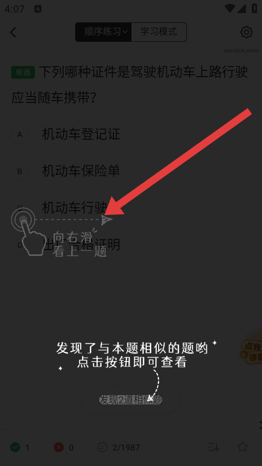 4、在答题的界面,可以选择向右滑可以看上一题,或者选择继续科目一题目的刷题。