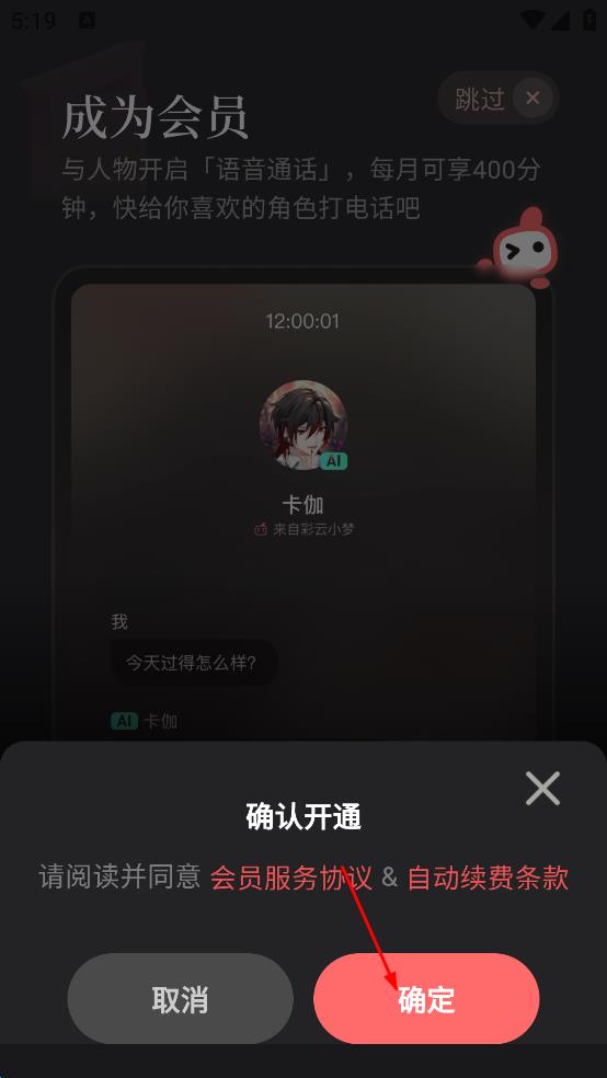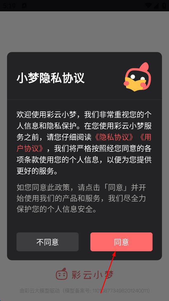 1、打开彩云小梦APP,弹出小梦隐私协议提示框,仔细阅读隐私协议和用户协议后,点击“同意”按钮,进入会员开通相关页面。