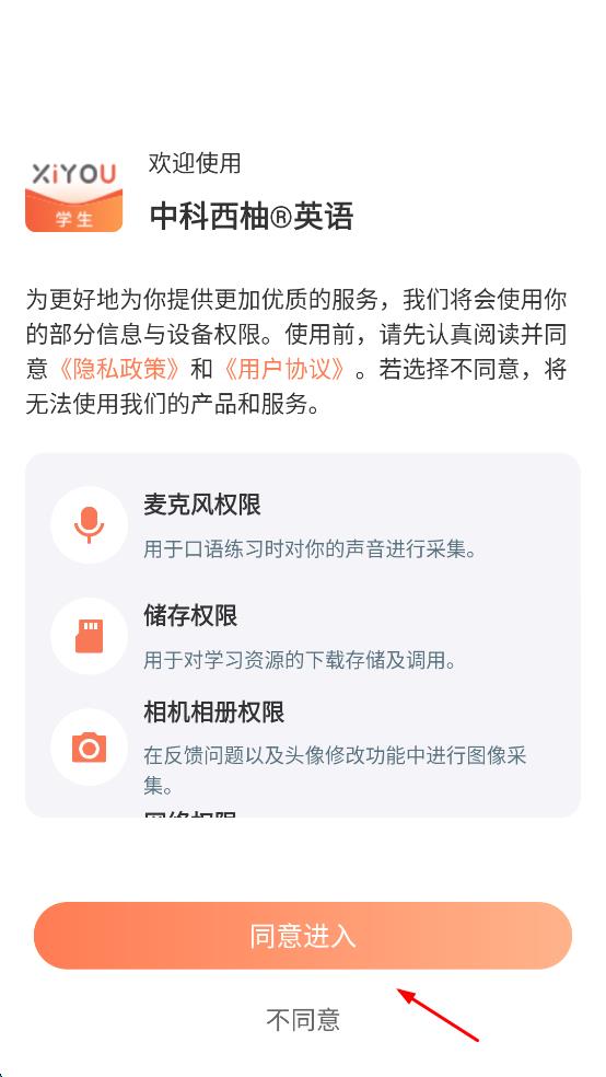 1、打开中科西柚英语APP,弹出权限及协议提示页面,仔细阅读隐私政策和用户协议后,点击“同意进入”按钮,进入登录或注册页面。