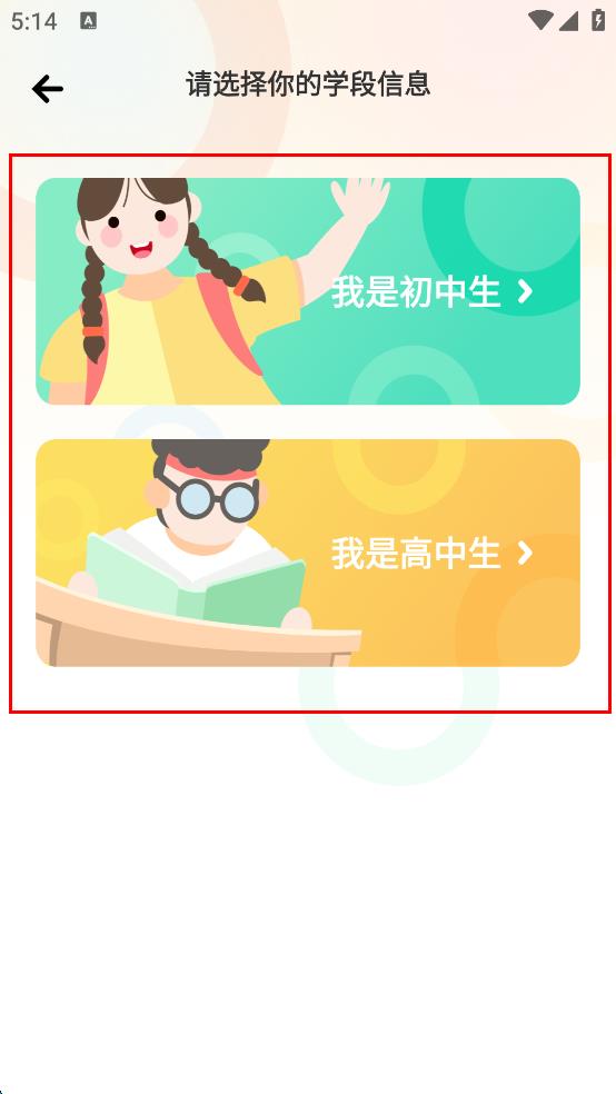 4、在学段信息选择页面,根据自身情况,选择“我是初中生”或“我是高中生”,完成学段选择后,即可进入APP主界面,开始使用相关英语学习功能。
