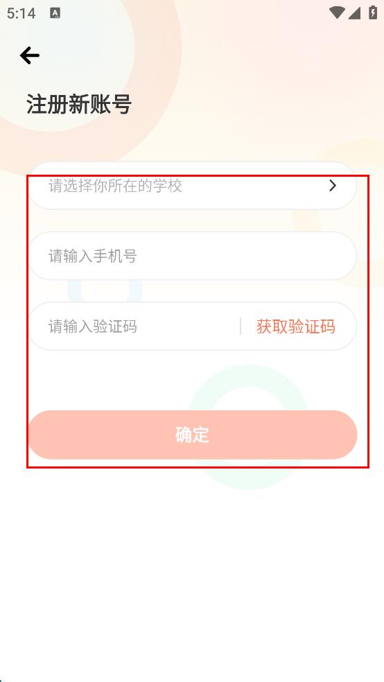 3、在注册新账号页面,选择所在学校,输入手机号码,获取并输入验证码,然后点击“确定”按钮,完成账号注册,接着进入学段信息选择页面。