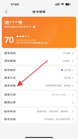 3、在账号管理中,向下滑动找到并点击登录设备。