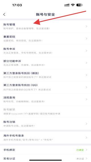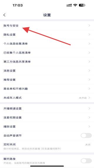 1、打开yy直播APP,在设置页面内找到并点击账号与安全的功能按钮。