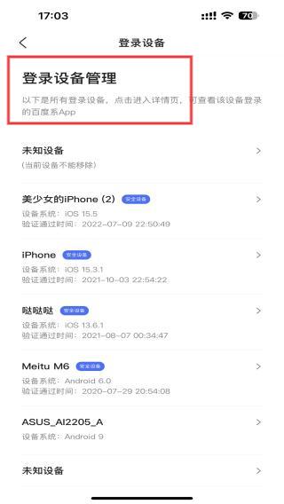 4、点击进入后,即可查看历史登录的设备、时间等信息。
