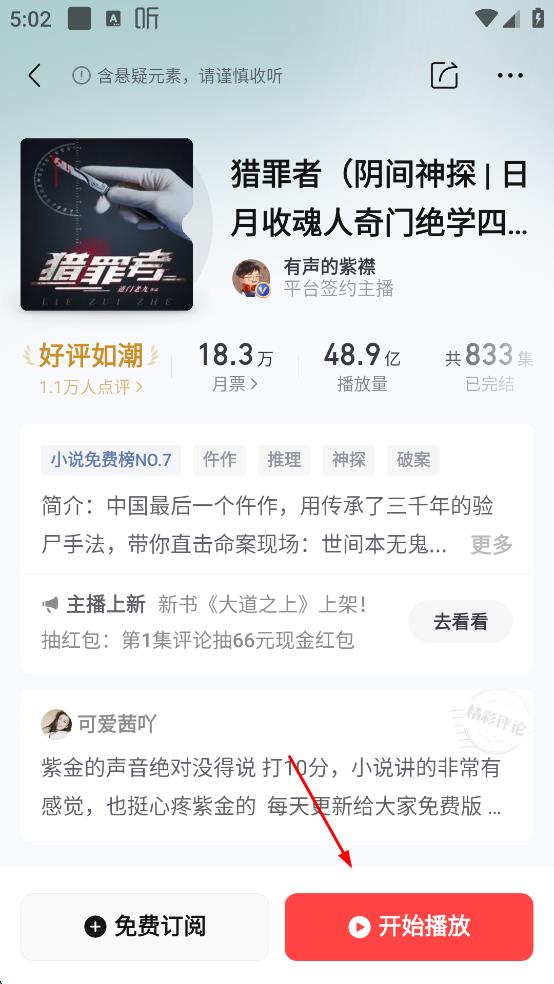 4、在作品详情页面,可查看作品的简介、播放量等信息,然后点击“开始播放”按钮,即可收听该音频作品。
