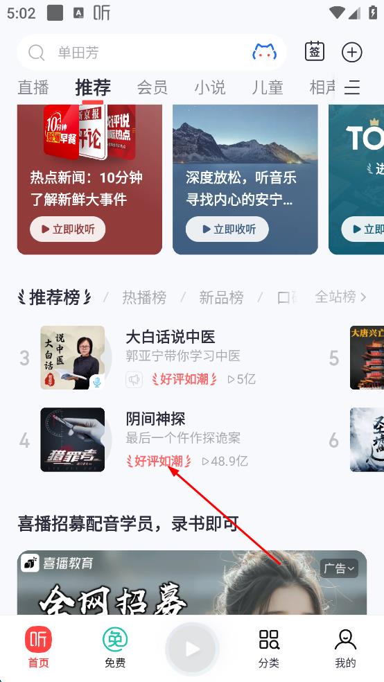 3、在APP主界面,浏览推荐的各类内容,找到感兴趣的音频作品,比如“阴间神探”,点击进入该作品的详情页面。