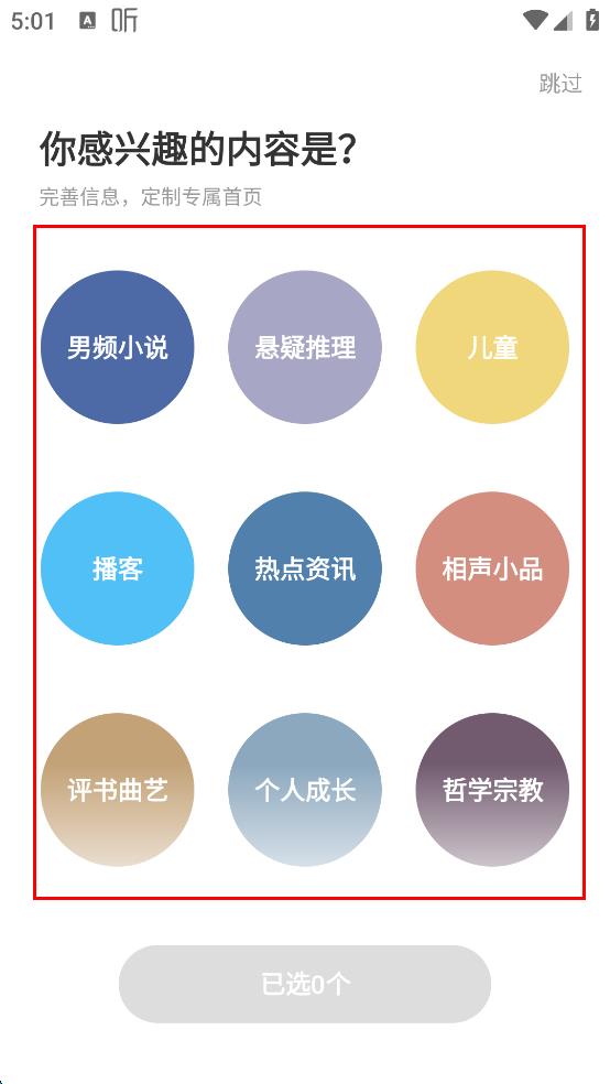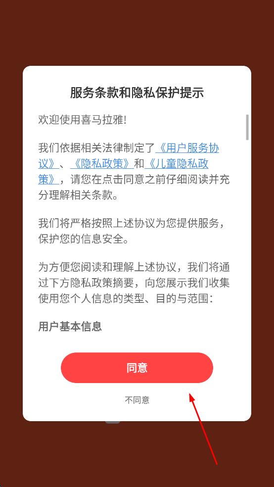 1、打开喜马拉雅APP,弹出服务条款和隐私保护提示框,仔细阅读相关内容后,点击“同意”按钮,进入APP内的兴趣选择页面。
