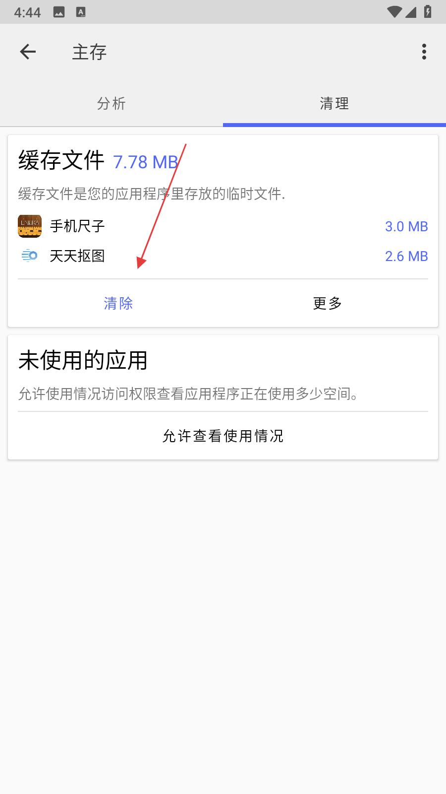 4、缓存文件删除完成后,页面上缓存文件板块消失,仅显示未使用的应用相关内容,完成缓存清理操作。