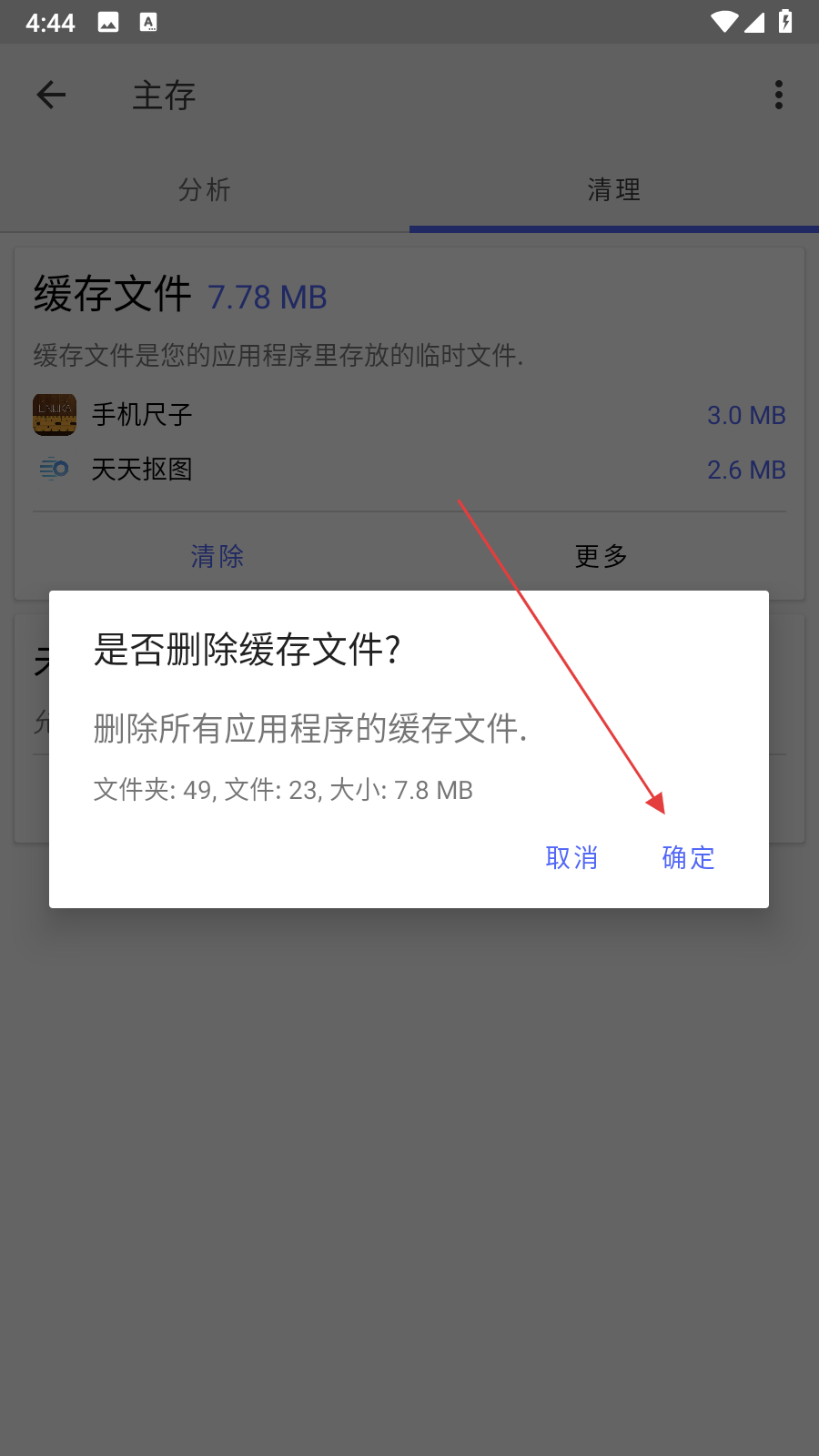 2、在主存清理页面,找到缓存文件板块,点击清除按钮,触发缓存删除确认弹窗。