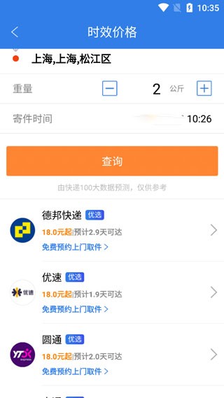 4.人性化服务体验支持快递预约上门取件,一键快速解决寄件需求;同时提供费用预估,帮助用户合理规划成本。