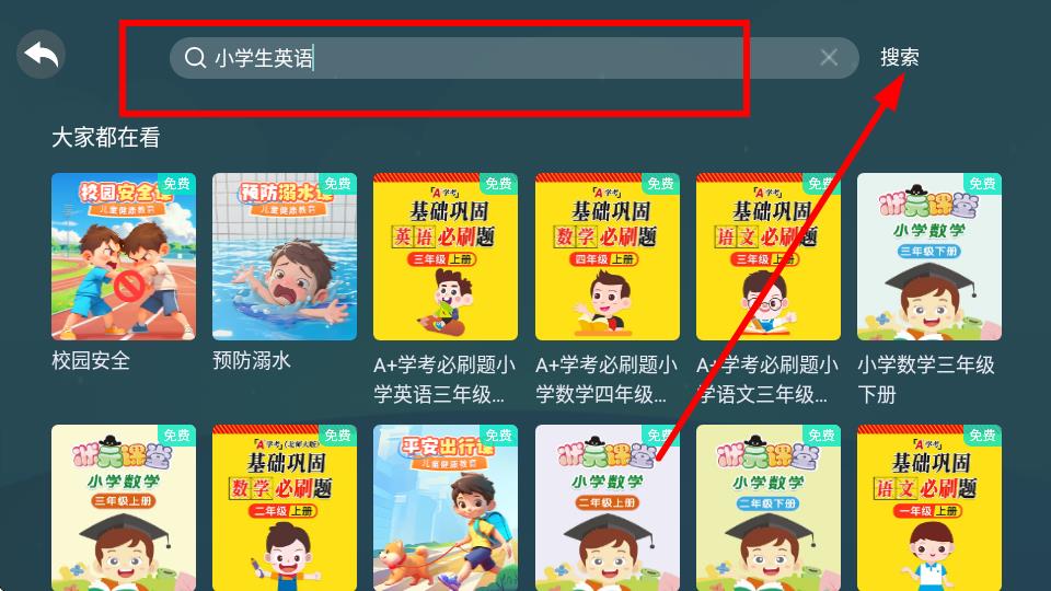 2、在搜索栏中输入想要查找的课程关键词,比如小学生英语,点击搜索按钮,界面会展示相关课程搜索结果。