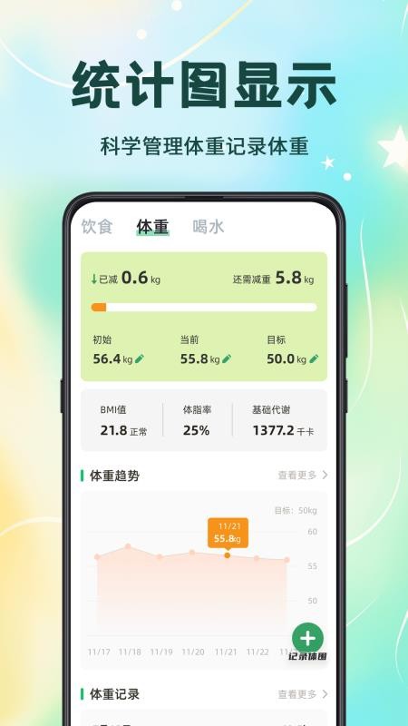 1、为用户生成了体重曲线图,让用户可以直观感受自己的体重变化。
