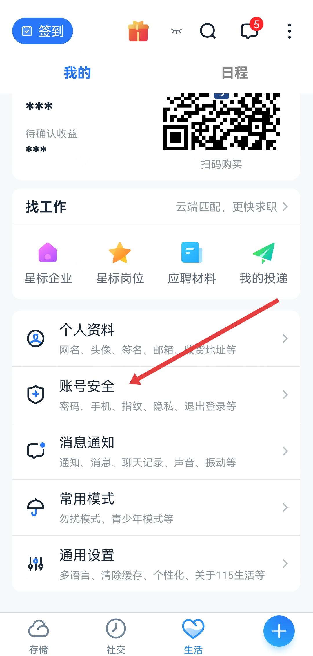 1、打开115生活APP,进入我的页面,点击账号安全选项,进入账号安全设置界面。