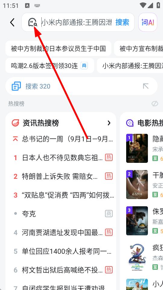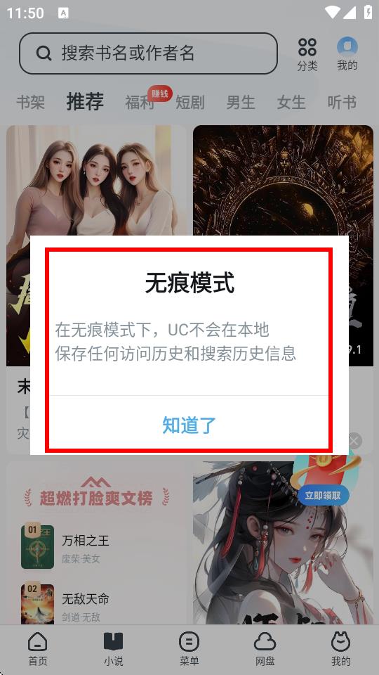 4、进入到搜索栏以后,在无痕模式下,uc浏览器不会在本地保存任何访问历史和搜索历史信息。