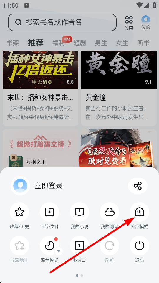 2、在弹出的菜单界面中,找到并点击无痕模式图标。