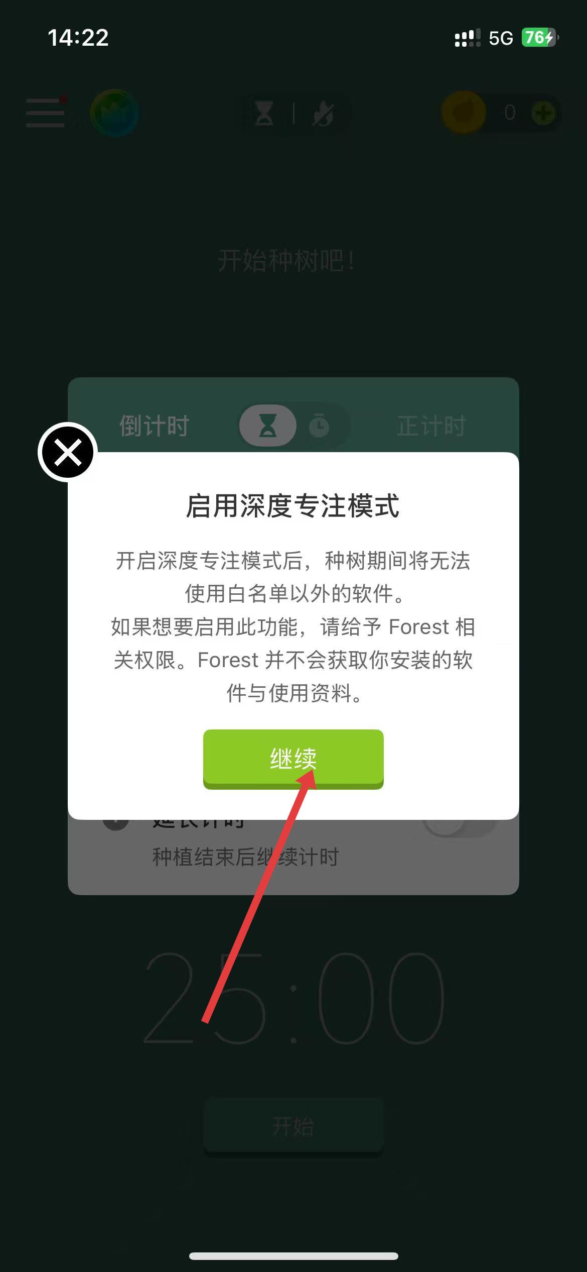 3会弹出权限提示窗口,点击继续并按指引授予Forest相关权限。