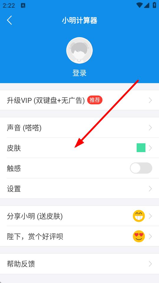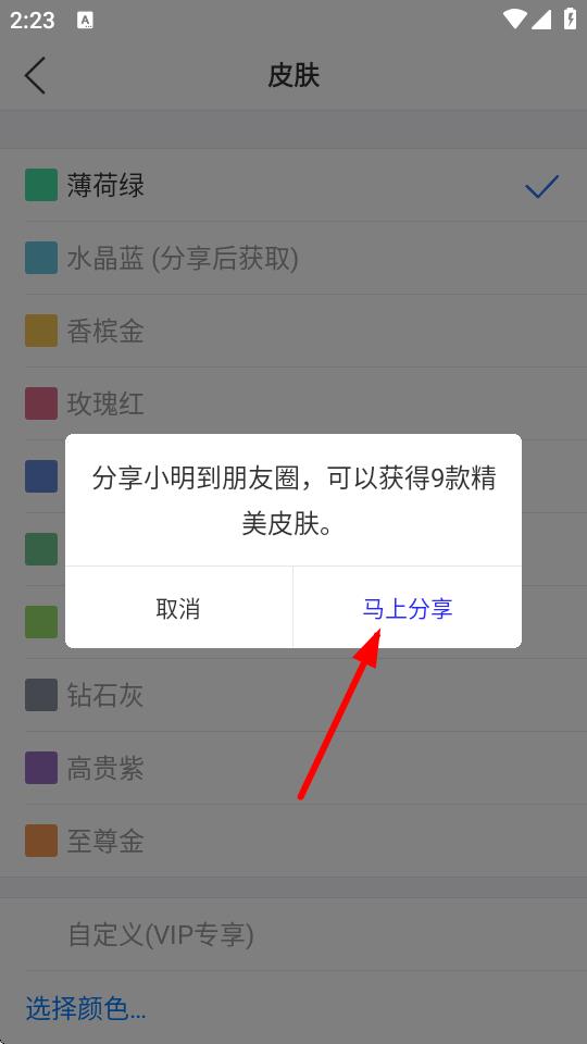 4、若想获取更多精美皮肤,按照提示点击马上分享,将小明计算器分享到朋友圈就能获得9款精美皮肤。