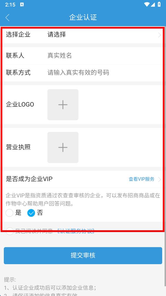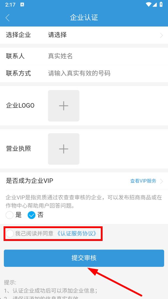 4、勾选同意认证服务协议后,点击提交审核按钮,等待平台审核通过,即完成企业认证。