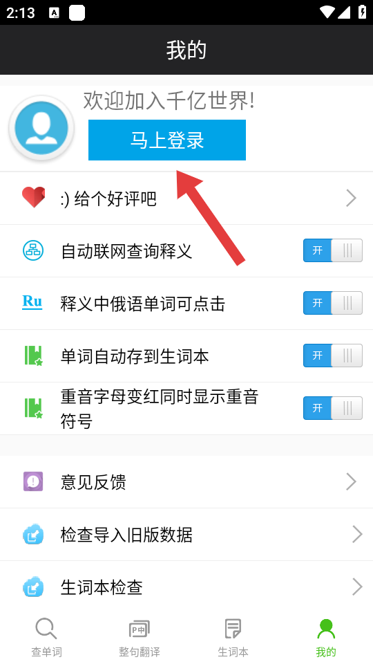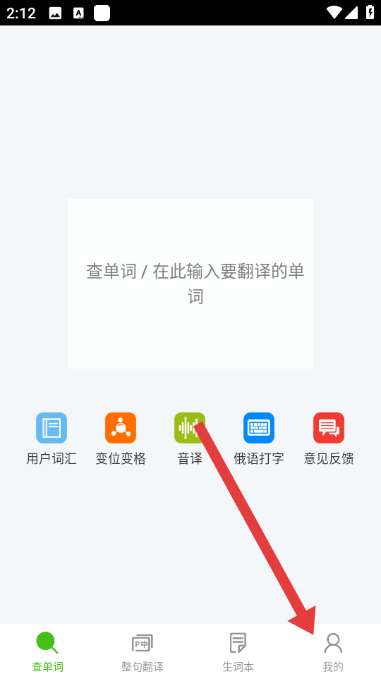 1、打开千亿词霸俄语词典APP,点击主界面右下角的我的选项,进入个人中心页面。