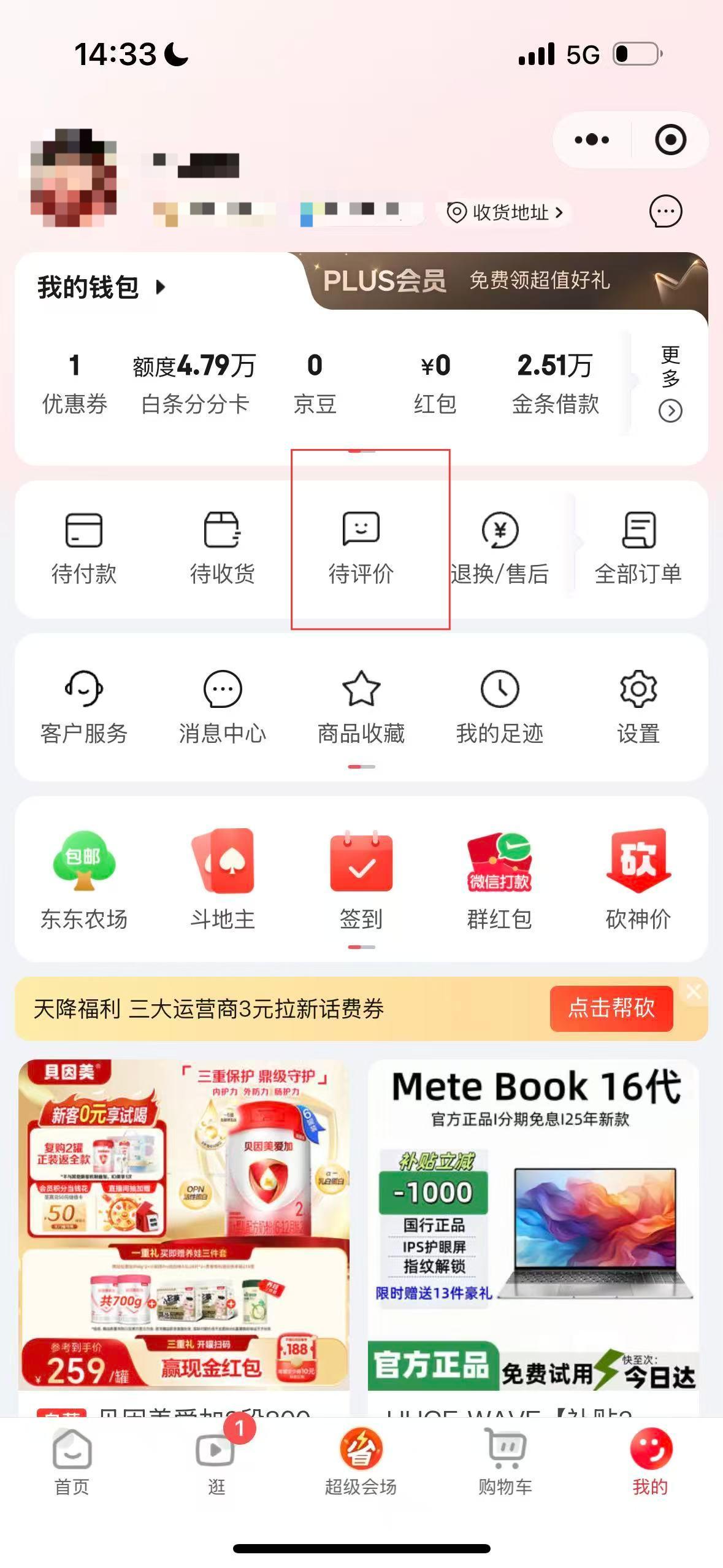 2、在个人中心页面,点击待评价,进入订单评价页面。