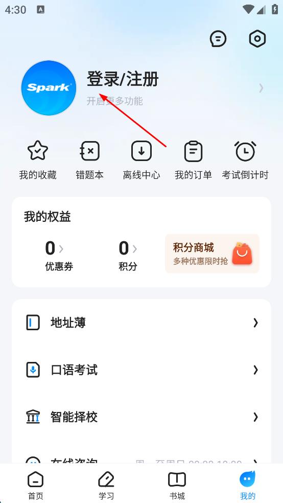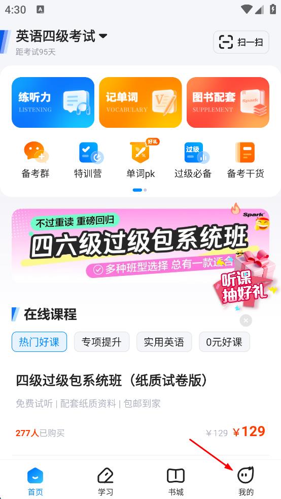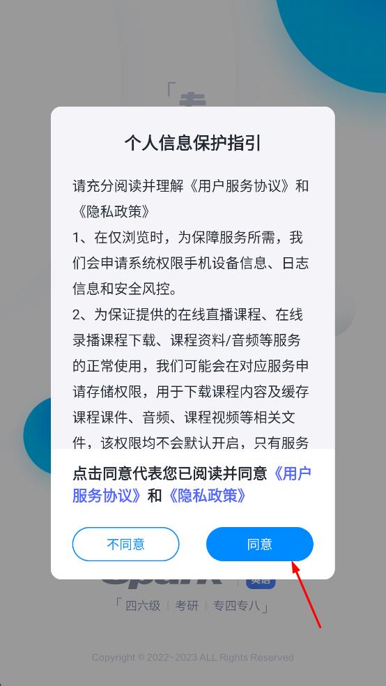 1、打开星火英语APP,在个人信息保护指引页面,点击“同意”,进入APP主界面后,点击右下角“我的”。