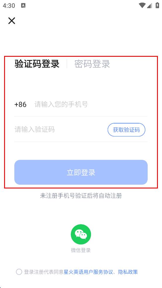 4、将收到的验证码输入到对应的验证码输入框中,确认信息无误后,点击“立即登录”按钮,即可完成星火英语APP的登录操作。