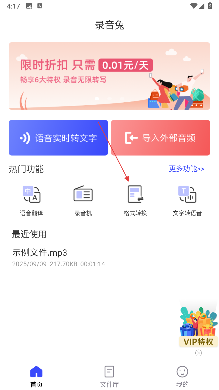 1、打开录音兔APP,在首页点击格式转换选项,进入音频转换页面后。