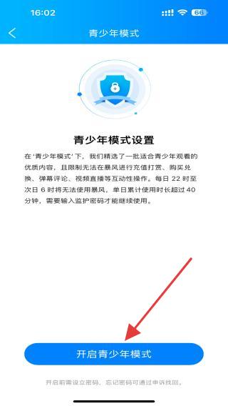 4、仔细阅读青少年模式设置,阅读后点击开启青少年模式即可。