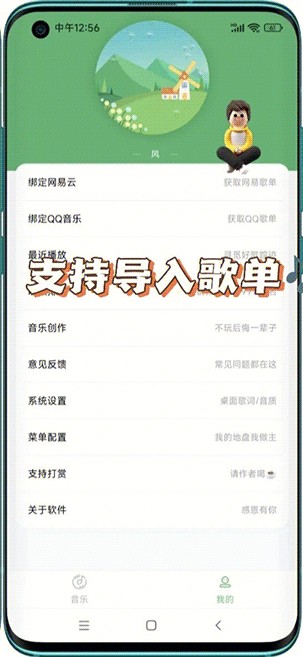 你可以在我的里面选择绑定网易云音乐和qq音乐账号,它就会自动同步你的歌单了,同时也可以自定义自行导入歌单,绑定成功后就可以在主页面查看。