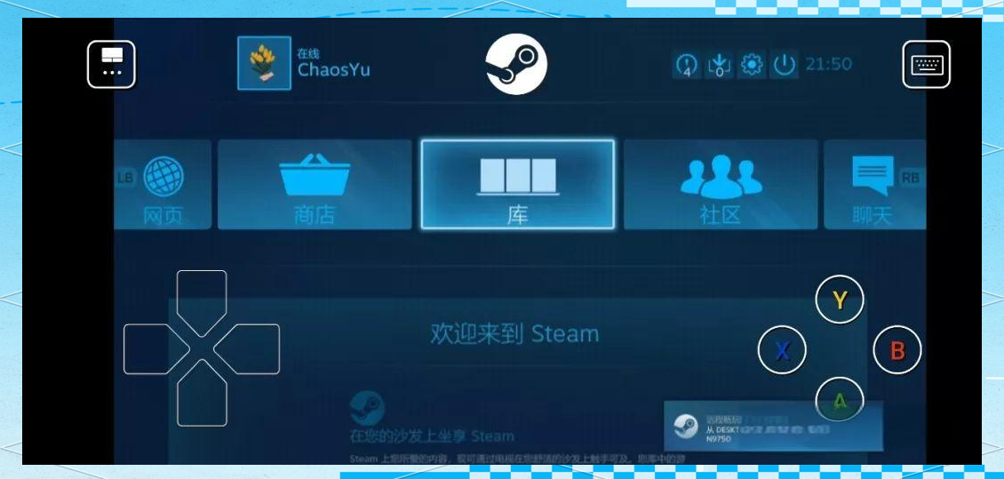 5、连接之后,steam会以大屏幕形式展现,如果你的移动设备连接手柄就可以直接使用手柄开始游玩,如果没有,steam也是准备了一套虚拟的按键供你体验。注意,不能关闭电脑哦。