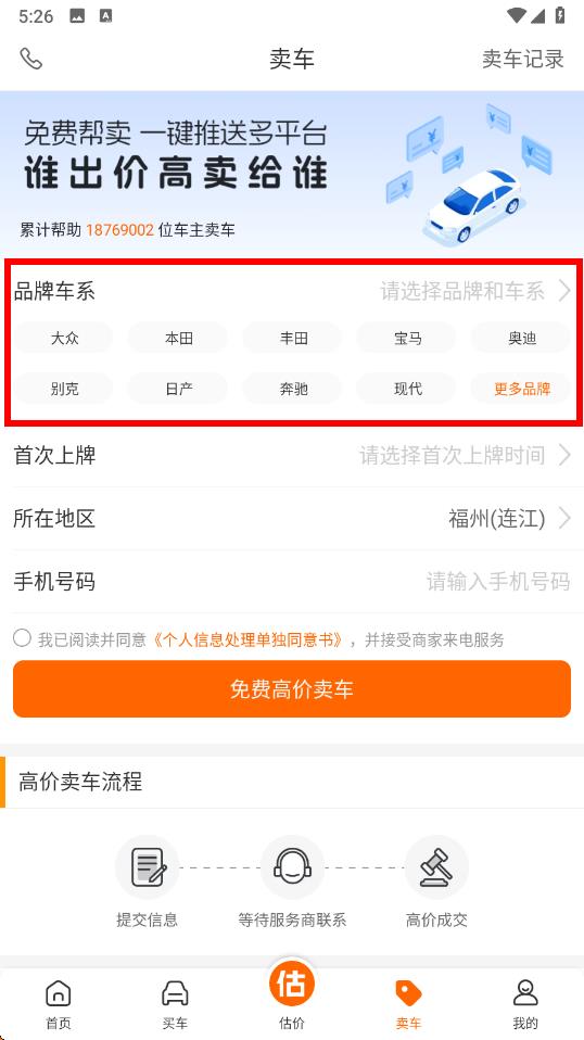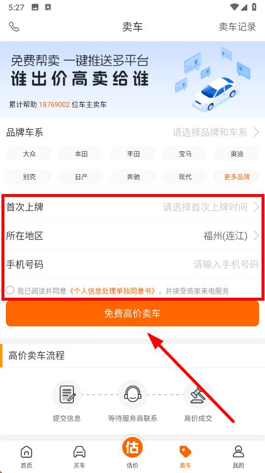4、接着依次填写首次上牌时间、所在地区、手机号码,勾选同意个人信息处理单独同意书,点击免费高价卖车按钮,即可发布卖车信息。