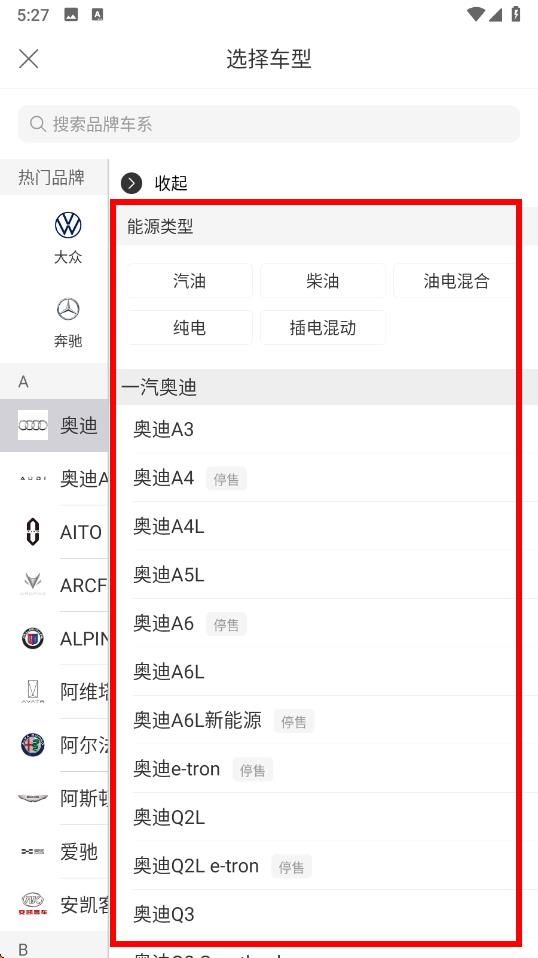 3、选择好品牌车系后,进一步选择车辆的具体车型以及能源类型。