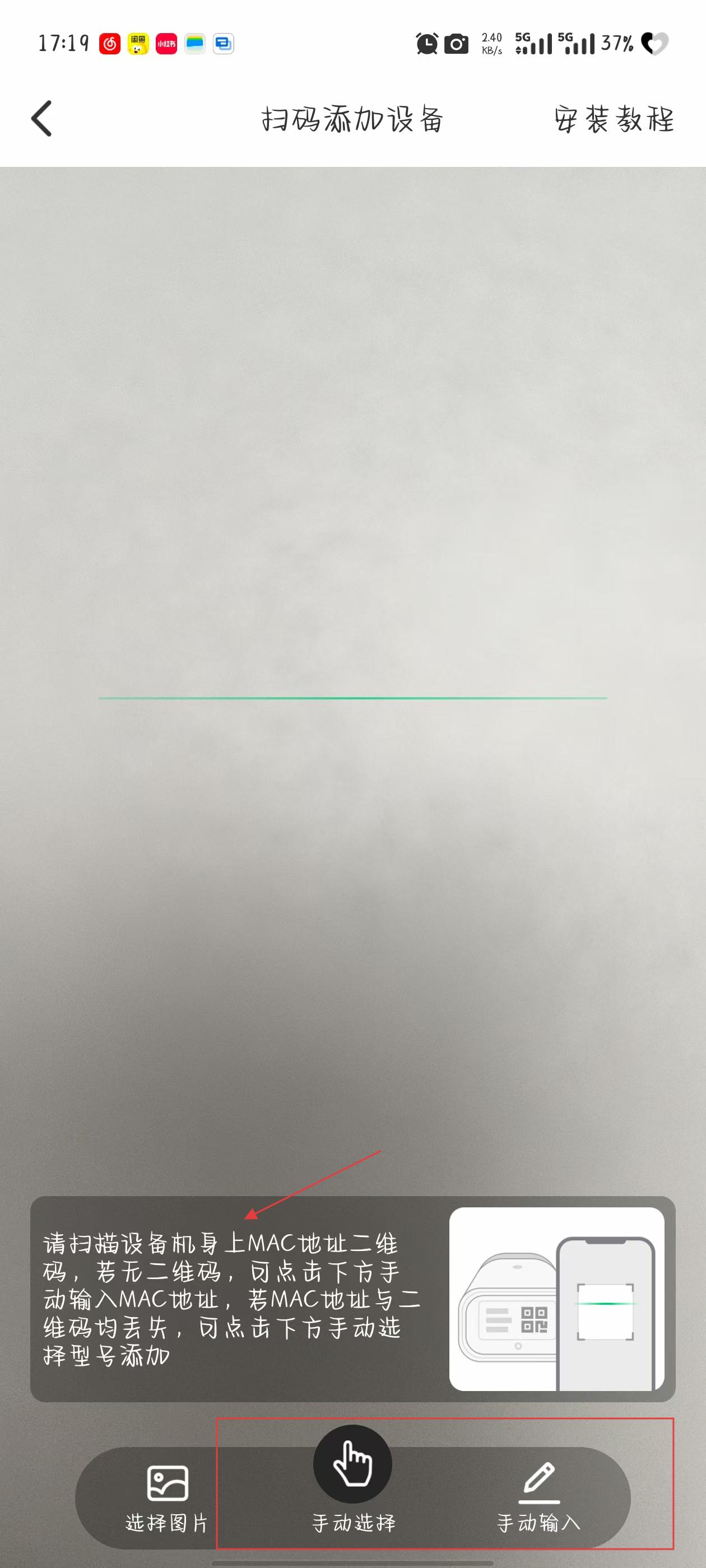 2、在扫码添加设备页面,若设备机身上有MAC地址二维码,可直接扫描,若无二维码,点击手动选择或手动输入选项。