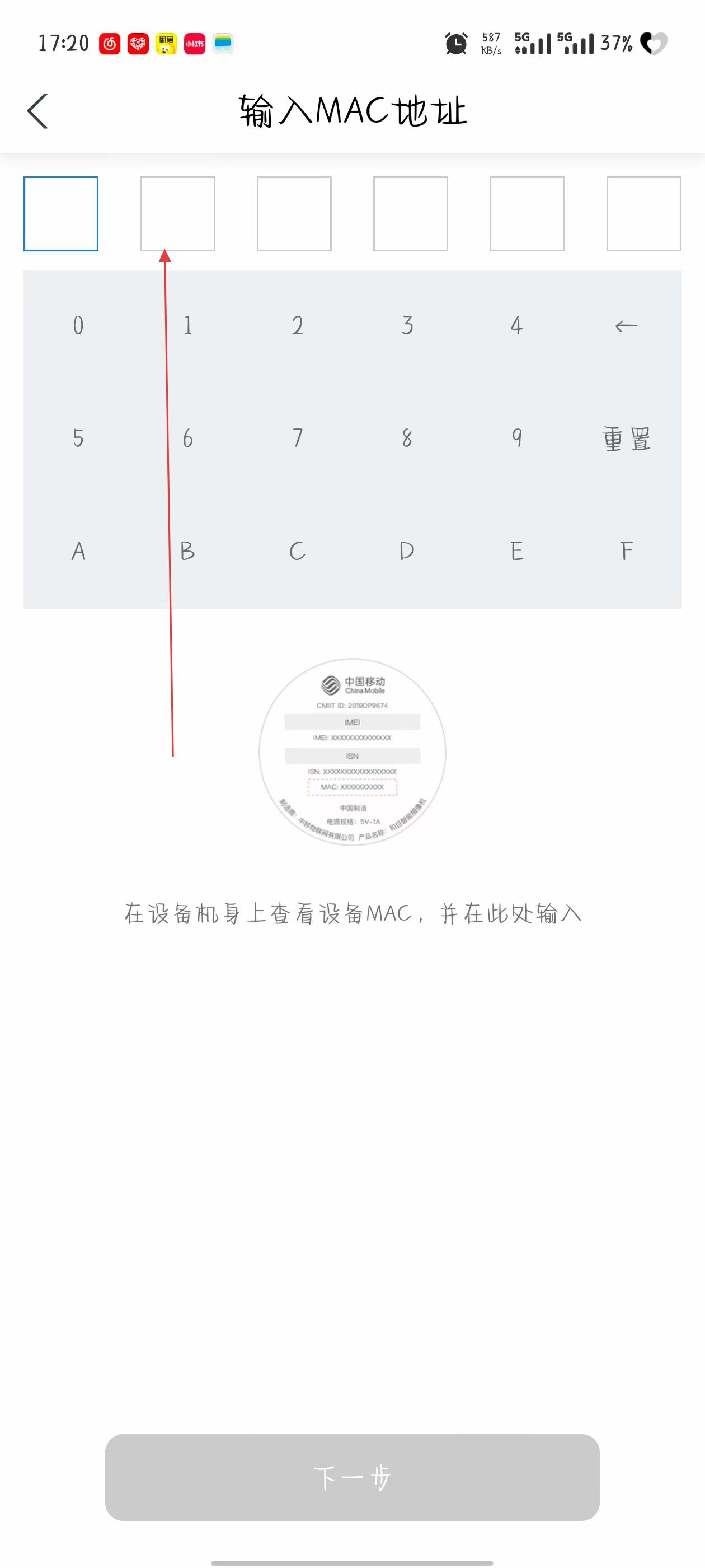 4、若选择手动输入MAC地址,在设备机身上查看MAC地址并依次输入,输入完成后点击下一步,按照提示完成后续设备添加流程。