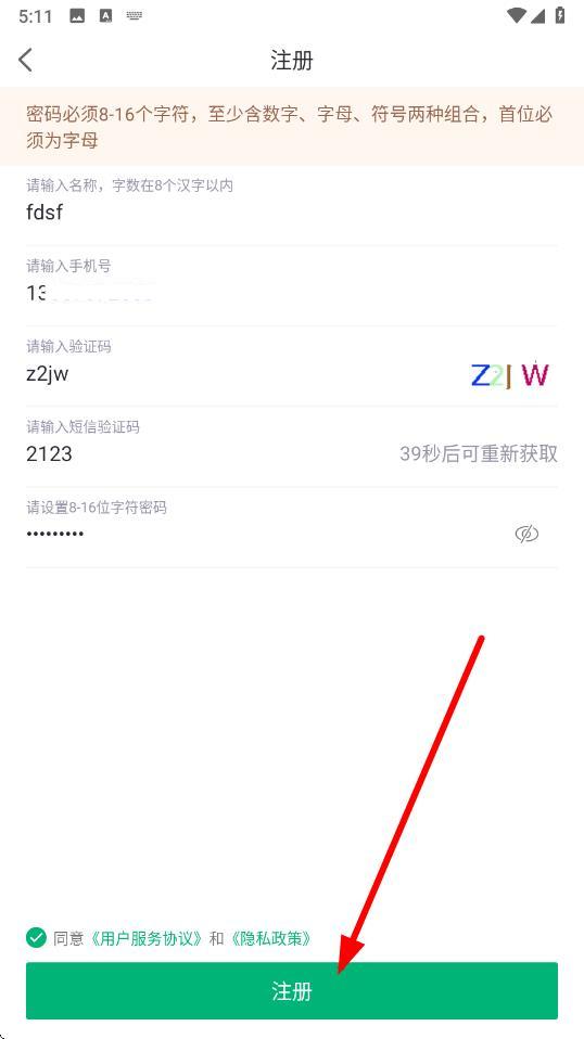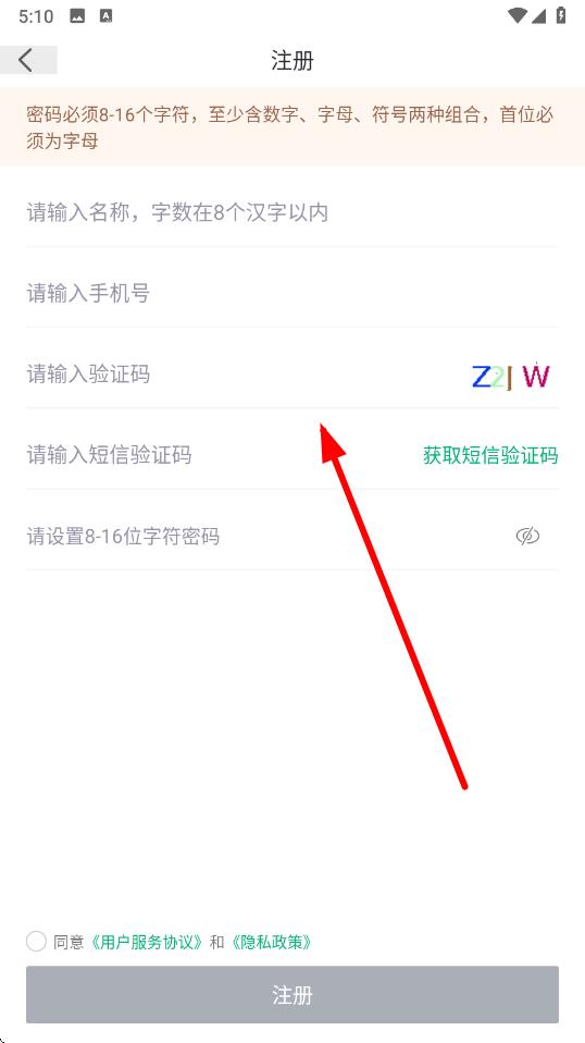 2、在注册页面,按照要求依次输入名称、手机号,接着填写验证码,将接收到的短信验证码填入对应框。