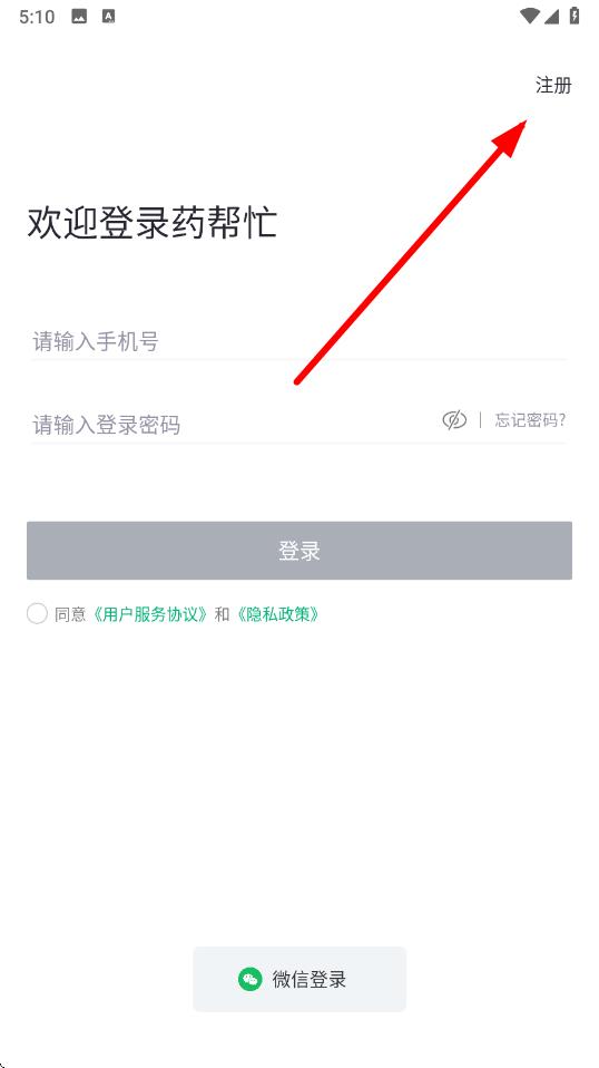1、打开药帮忙app,在登录界面点击右上角的注册选项,进入注册页面。