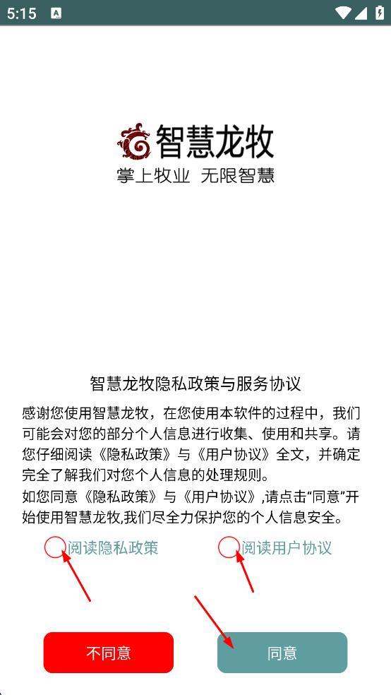1、打开智慧龙牧APP,在隐私政策与服务协议页面,勾选阅读隐私政策和阅读用户协议,然后点击同意,进入APP主界面。