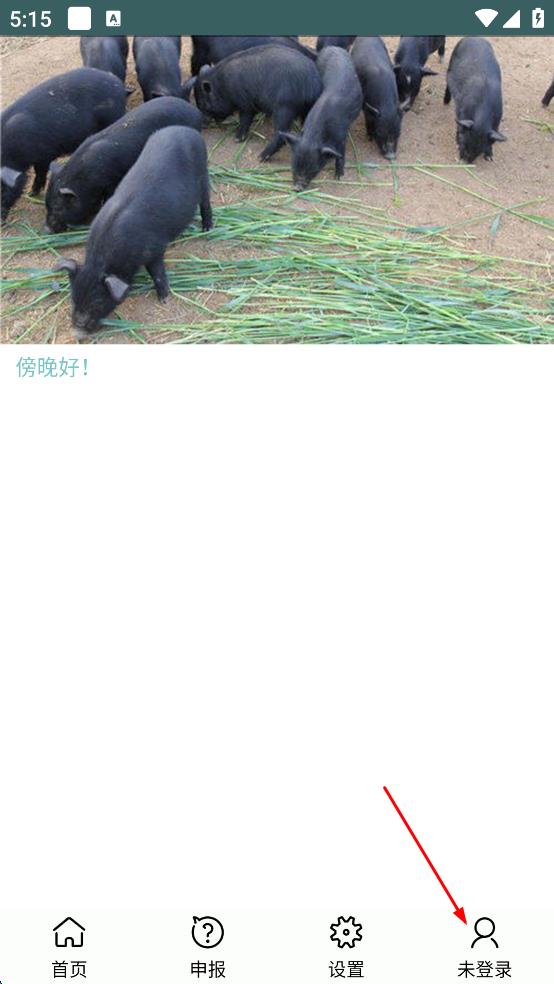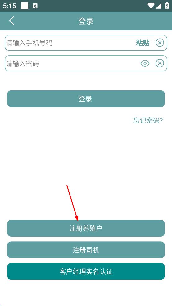 2、在APP主界面,点击右下角“未登录”,进入登录页面,点击注册养殖户或根据自身身份选择注册司机等,进入注册须知页面。