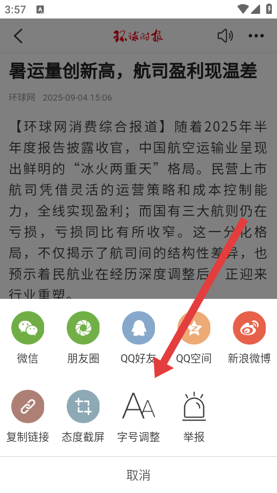 3、在弹出的功能菜单中,点击字号调整的选项,即可调整新闻字体的大小。