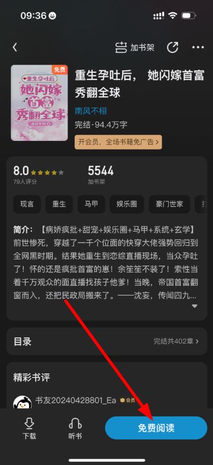 1、打开QQ阅读APP在书城找到想加入书架的小说,如《重生孕吐后,她闪嫁首富秀翻全球》,点击小说进入书籍详情页。