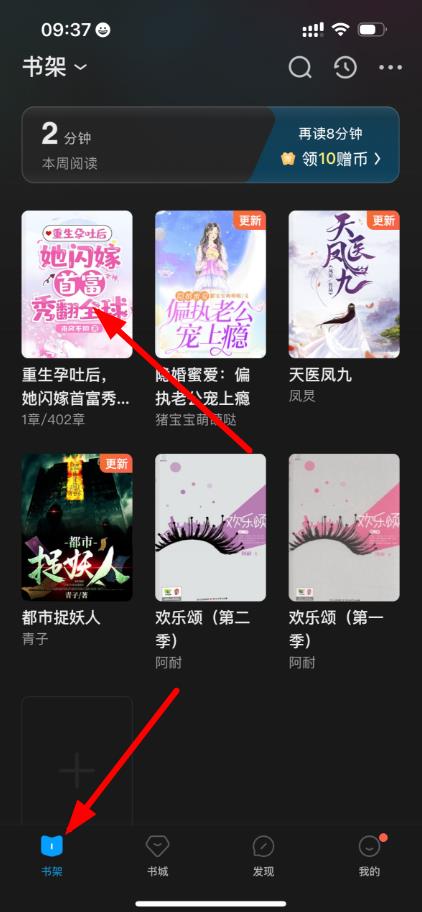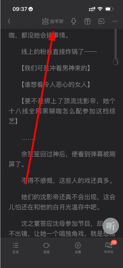 3、阅读小说过程中点击屏幕上方,也能看到“加书架”图标,点击它同样能把正在阅读的小说添加到书架之后点击底部“书架”按钮,就能在书架中找到已添加的小说。