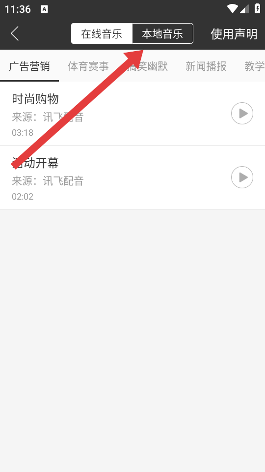 4、在音乐选择页面,点击本地音乐的标签,即可切换到本地音乐列表进行选择。