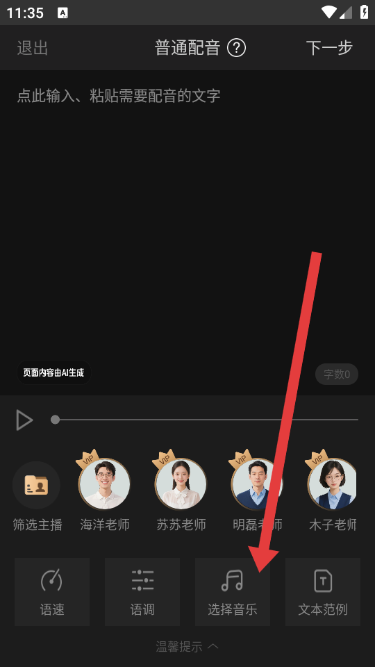 3、在普通配音界面,点击下方的选择音乐选项,进入音乐选择页面。