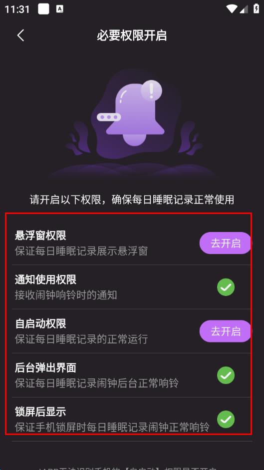 3、进入必要权限开启页面,可多种权限及开启状态,若需开启某权限,点击去开启按钮。