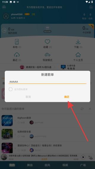 3、弹出新建歌单输入框后,输入想要的歌单名称,点击确定的按钮。