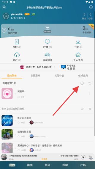 2、在个人页面中,在我的歌单下找到并点击+号的功能图标。