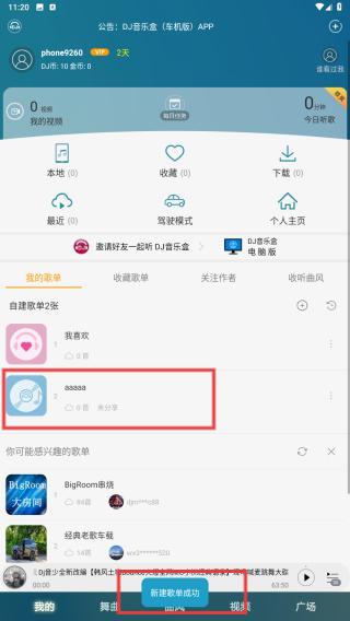 4、点击后,界面会弹出新建歌单成功,并在我的歌单中进行查看。