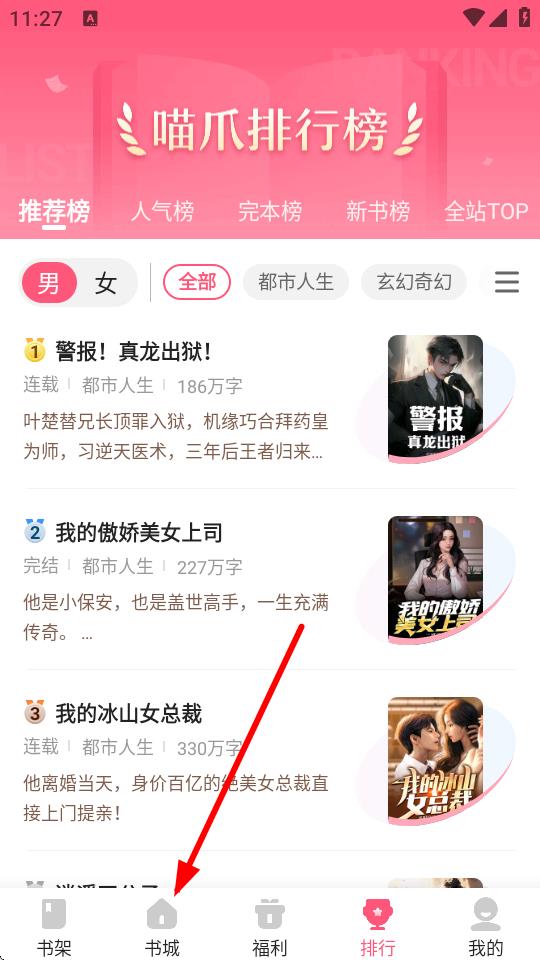 1、打开喵爪小说App,点击底部导航栏中的书城选项,进入书城页面。