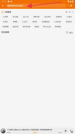 3、在搜索框中输入要查找的歌曲名或相关关键词,输入后点击搜索按钮。