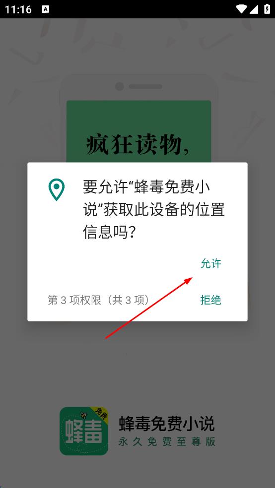 1、打开蜂毒免费小说应用,弹出获取设备位置信息的提示框,点击“允许”,进入到应用主界面。